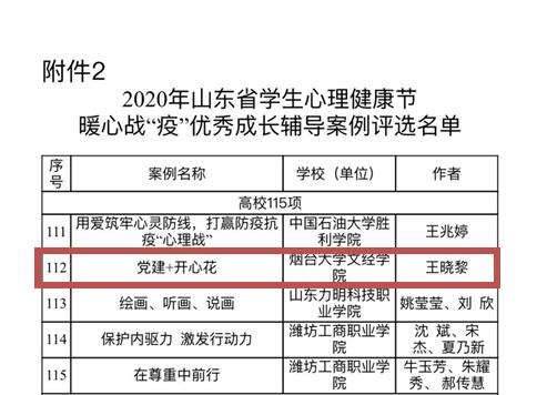 为深入学习贯彻习近平新时代中国特色社会主义思想,扎实做好新冠肺炎疫情防控下的心理健康教育工作,提升我省学校心理育人工作质量,山东省于2020年5月至6月组织举办学生心理健康节活动。烟台大学文经学院韩聪聪老师指导的特色活动和王晓黎老师发表的辅导案例获奖。