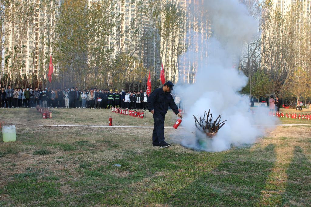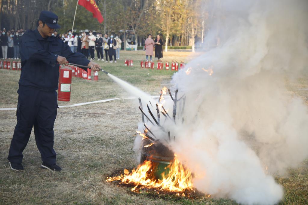 演练过程中,保卫部部长徐宝军、副部长赵彬现场指挥,王华峰老师介绍了突发火情如何正确拨打火警电话、如何应对初期火灾、灭火器的类型跟使用等消防常识,现场演示如何正确使用不同类型的灭火器。同时,还设立了四个真实着火点进行灭火器操作演练。